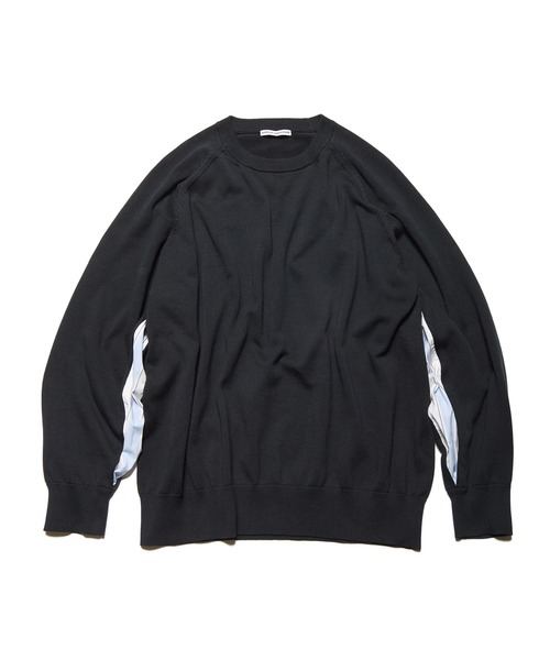 シルクを思わせる上品な光沢としなやかな風合いを併せ持つインド由来のスビンコットンを用いたハイゲージニット。両袖バックサイドに切り込みを施しており、その内側の別生地にはカラーごとにストライプやデジタルカモフラ柄を採用してシーズンムードを表現しています。