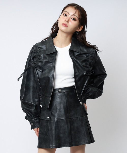 ほんのりくすんだ、ヴィンテージライクな風合いの合皮で仕上げたショートジャケット。袖はふんわり立体感のあるパフデザイン、フロントにはギャザーを寄せたリボンを施し、“甘さと強さ”を絶妙にミックスした一枚です。 ショート丈なのでウエスト位置が高く見え、スタイルアップ効果も抜群。 シンプルなトップスの上に羽織るだけで、こなれ感のあるストリートガーリーコーデが完成。 ヴィンテージ調の質感が加わることで、合皮でも硬すぎず、雰囲気のある仕上がりになっています。 ********************** 透け感:なし 光沢感:ややあり 生地の厚さ:普通 ********************** ※モニター・環境等により実際の商品と多少色味が異なって表示される場合がございます。 予めご了承をお願いいたします。 ※サイト上のカラー名と、お届け商品に記載されているカラー名が異なる場合がございます。 ※他のキャンペーンにより、期間中に価格が変動する場合があります。 ※セールは予告なく終了させていただく場合もあります。