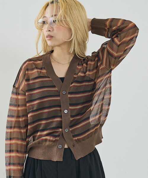 シアーの透け感で楽しむ夏までの羽織り-Design-かなり薄手のシアーニットを使った軽やかなカーディガン。ボディは透け感のあるジャガードメッシュ、リブ部分は程よい厚みでメリハリのある表情に仕上げています。着丈は腰回りに収まるショート〜標準丈、多めの身幅でインナーを選ばずレイヤードしやすいのがポイント。ライトグレー・ブラウンはマルチボーダー柄、レッド・ブラックは無地で印象が大きく変わるため、色違いで揃えたくなるアイテムです。夏の冷房対策から春先の羽織りまで活躍する一枚。-Cordinate-・キャミソール+ハイウエストデニムで腰位置を意識した抜け感スタイル(シアー素材がインナーを軽やかに見せます)。・Tシャツ+ワイドパンツ+サンダルでカジュアルな休日コーデに。薄手なので夏の夕方まで羽織として持ち運べます。・ライトグレー/ブラウンのマルチボーダーは、同色系のスカーフや小物で統一感を出すとまとまり良し。【注意事項】※商品画像は、光の当たり具合やパソコンなどの閲覧環境により、実際の色味と異なって見える場合がございます。あらかじめご了承ください。※画像の商品はサンプルです。※商品の色味の目安は、商品単体の画像をご参照ください。※商品を使用前に、タグ等に記載されている「取り扱い上の注意書き」「洗濯表示」を必ずご確認ください。※商品に不良が無い場合、包装紙および箱の破損がございましても発送いたします。あらかじめご了承ください。==============▼商品のお気に入り登録▼♡をタップorクリック!完売カラーの再入荷や、ラスト1点の通知、セールの際の通知を受ける事ができます。▼ブランドのお気に入り登録 ▼新商品や再入荷など、ブランドのお得な情報をいち早く受ける事が出来ます。==============