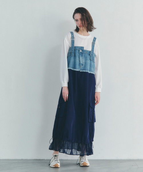 モードカジュアルなデニムMIX デニムとカーゴスカートをドッキングした、リメイク風のデザインがこなれた印象を叶える一枚。 ヴィンテージ感のある上部のオーバーオール風デザインは、高めの切替え位置でスタイルアップを実現。 裾にあしらったチュールにはプリーツ加工を施し、大人っぽい縦ラインを演出。 ドロストを絞ってシルエットのアレンジも楽しめます。 アジャスター付きのストラップで3段階の長さ調整が可能。 バックスタイルはギャザーゴム入りで程よいフィット感のある着心地です。 ミリタリー調の落ち着いた色味とディテールが都会的なムードを演出。 レイヤード次第でロングシーズン使える汎用性も魅力です。 毎日のスタイルに個性を添えるアイテムです。 透け感[ややあり] 生地の厚さ[普通] 光沢感[あり] 伸縮性[ややあり] 裏地[なし] ※モデル着用画像は、光の当たり具合で色味が違って見える場合がございます。 ※お使いのモニター環境によって商品の色味が違って見える場合がございます。  ̄ ̄ ̄ ̄ ̄ ̄ ̄ ̄ ̄ ̄ ̄ ̄ ̄ ̄ ̄ ̄ ̄ ̄ ̄ ●Editt by YECCA VECCA ● (エディット バイ イェッカ ヴェッカ) 着心地のよいシルエットに都会的でエッジの効いたディテール使いで仕上げたモードなアイテム。 YECCA VECCAというフィルターを通して編集する(=Edit) こだわりを持ち続ける大人の女性のためのカジュアルクローズを提案。 ▼商品のお気に入り登録がおすすめです ▼ 商品ページ内のハートマークをクリック。完売時の再入荷や、最後の1点の通知、最後の1点など、お得なお値下げ情報を受けとる事ができます。 【お知らせ】ページでも通知が確認できます。  ̄ ̄ ̄ ̄ ̄ ̄ ̄ ̄ ̄ ̄ ̄ ̄ ̄ ̄ ̄ ̄ ̄ ̄ ̄