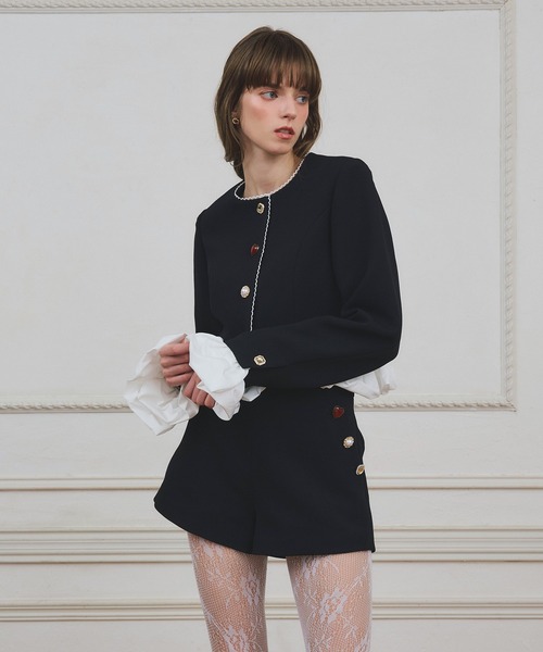 ミニマルな中に、さりげない個性が光るショートパンツ。【Design】ミニマルなフォルムに、サイドへ配したハートのビジューボタンが印象的なショートパンツ。装飾を片側にまとめることで、甘さを抑えた洗練されたバランスに仕上げました。程よい丈感と立体的なシルエットが、脚をすっきりと美しく見せてくれます。【Styling】同素材のジャケットと合わせたセットアップスタイルで、完成度の高いレディコーデに。シンプルなブラウスやニットを合わせれば、デイリーにも取り入れやすい着こなしが完成します。足元はヒールからフラットまで幅広く相性◎。【Fabric】ハリ感のある素材を使用し、シルエットを美しくキープ。程よい厚みでボディラインを拾いにくく、安心感のある穿き心地です。シーズンレスに活躍する素材感も魅力。【Material】表地:ポリエステル100%裏地:ポリエステル100%家庭洗濯不可 ドライクリーニング可厚み:□薄手 ■普通 □厚手透け感:■なし □あり伸縮性:■なし □あり裏地:□なし ■あり注意:お使いのモニターによって、カラーが違って見える場合がございます。※素材・仕様は一部変更になる場合がございますので予めご了承ください。★《お気に入り登録》でお得な情報がいっぱい★・「商品のお気に入り登録」で再入荷通知や、ラストの通知、セール通知も受け取ることができます。・「ブランドのお気に入り登録」で新商品や再入荷など、お得な情報を受け取ることができます!【eimy istoire/エイミーイストワール】女性はみんな綺麗になりたいだからお洒落が大好きでやめられないそんな女性に贈る最高に美しい物語メーカー品番:1126120022