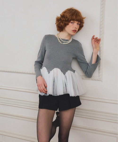 静かに甘さを仕込む、レイヤード風ドッキングチュールニット。【Design】シンプルなニットトップスに、ふんわりとしたチュールをドッキングしたデザイン。ウエスト位置で切り替えた異素材のコントラストが、自然とスタイルアップを叶えます。甘さを主張しすぎない控えめなフレア感で、EIMYらしい洗練されたフェミニンさを演出。一見ミニマルでありながら、さりげない表情のある一枚です。【Styling】テーパードパンツやスラックスと合わせて、大人っぽく甘さを引き算したスタイリングがおすすめ。ミニスカートやショートボトムと合わせれば、程よく可憐な印象に仕上がります。一枚でレイヤードスタイルが完成するため、忙しい日でも簡単にコーディネートが決まるのも魅力。ジャケットインしても、裾のシアーがさりげないアクセントになります。【Fabric】上身頃には伸縮性のあるニット素材を使用し、快適な着心地を実現。裾部分には軽やかなシアー素材を組み合わせ、動くたびに柔らかな揺れ感をプラス。異素材ながらも肌あたりが良く、長時間の着用でもストレスフリーな仕上がりです。【Material】表地:ポリエステル54% ナイロン23% 再生繊維(セルロース)19% 毛3% 絹1%別布:ポリエステル100%手洗い可 ドライクリーニング可 ウェットクリーニング可厚み:□薄手 ■普通 □厚手透け感:■なし □あり伸縮性:□なし ■あり裏地:■なし □あり注意:お使いのモニターによって、カラーが違って見える場合がございます。※素材・仕様は一部変更になる場合がございますので予めご了承ください。★《お気に入り登録》でお得な情報がいっぱい★・「商品のお気に入り登録」で再入荷通知や、ラストの通知、セール通知も受け取ることができます。・「ブランドのお気に入り登録」で新商品や再入荷など、お得な情報を受け取ることができます!【eimy istoire/エイミーイストワール】女性はみんな綺麗になりたいだからお洒落が大好きでやめられないそんな女性に贈る最高に美しい物語メーカー品番:1126111322