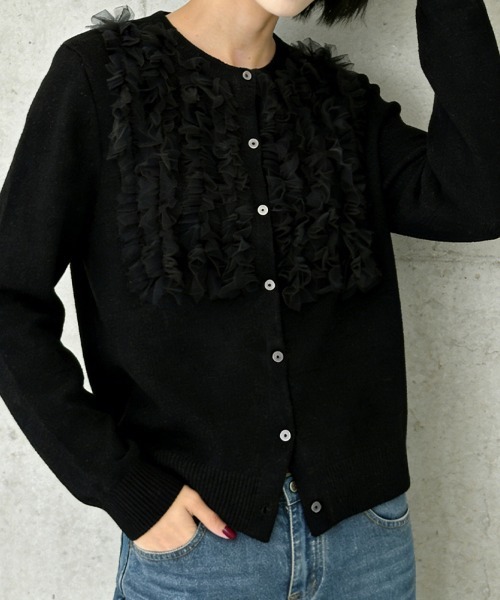 フロントに施された縦フリルが印象的な長袖カーディガンです。 ボタン付きの前開き仕様で、羽織りとしてもトップス使いとしても活躍します。 フリルは立体感のある構成で、シンプルなコーデに華やぎを添えてくれます。 袖口はすっきりとしたラインで、手元まで上品にまとまるデザインです。 裾はストレートラインで、パンツにもスカートにも合わせやすいバランス感。 バックスタイルは無地で仕上げられ、前面のフリルが際立つ構成です。 きれいめにもカジュアルにも使える、着回し力の高い一枚です。 …………………… 厚さ:ふつう 伸縮性:あり 透け感:なし 裏地:なし ポケット:なし モデル:身長160cm(着用サイズ:フリー) 季 節:春/秋 …………………… ★お買いものをよりお楽しみいただく為に!★ ◆商品のお気に入り登録 お気に入りアイテムの完売カラーの再入荷通知や、ラスト1点の通知、セールの通知も受け取ることができます。 ◆ブランドのお気に入り登録 新商品や再入荷など、クーポン配布などのお得な情報を受け取ることができます。 ※商品画像は撮影時の光や角度により、実物の色味と異なって見える場合がございます。 ※撮影はサンプル品を使用しており、表示のサイズ感も実物とは若干異なる場合もございますので、予めご了承ください。 ※生産時期により色・素材・サイズ感など多少異なる場合がございます。予めご了承ください。※販売商品以外のモデルが着用している商品は、モデル個人の私物となります。予めご了承ください。