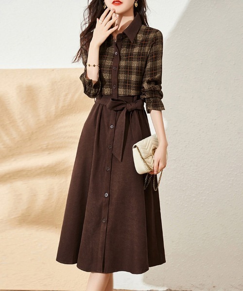 チェック柄シャツと無地スカートのセットアップ風ワンピースです。 トップスは襟付きの長袖シャツで、クラシカルな印象ときちんと感を演出します。 スカートはフロントボタン付きのAラインシルエットで、足元まですっきりとした印象に。 ウエストには共布リボンが施され、スタイルアップとメリハリのある着こなしが叶います。 バックスタイルはシンプルに仕上げられ、前面のチェック柄とリボンが際立つ構成です。 パンプスにもブーツにも合わせやすく、きれいめにもカジュアルにも使える一枚です。 アクセやバッグ次第で雰囲気を変えられる、着回し力の高いアイテムです。 …………………… 厚さ:ふつう 伸縮性:なし 透け感:なし 裏地:なし ポケット:なし モデル:身長163cm(着用サイズ:フリー) 季 節:春/秋 …………………… ★お買いものをよりお楽しみいただく為に!★ ◆商品のお気に入り登録 お気に入りアイテムの完売カラーの再入荷通知や、ラスト1点の通知、セールの通知も受け取ることができます。 ◆ブランドのお気に入り登録 新商品や再入荷など、クーポン配布などのお得な情報を受け取ることができます。 ※商品画像は撮影時の光や角度により、実物の色味と異なって見える場合がございます。 ※撮影はサンプル品を使用しており、表示のサイズ感も実物とは若干異なる場合もございますので、予めご了承ください。 ※生産時期により色・素材・サイズ感など多少異なる場合がございます。予めご了承ください。※販売商品以外のモデルが着用している商品は、モデル個人の私物となります。予めご了承ください。