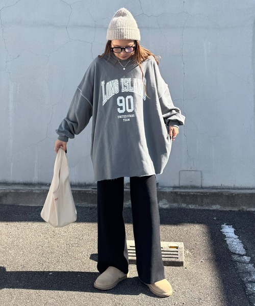 ロゴプリントステッチオーバースウェット(chiica select) / 長袖 クルーネック ラウンドネック カットソー レタリング ルーズ丈 ビッグシルエット 英字ロゴ チャコール アイボリー