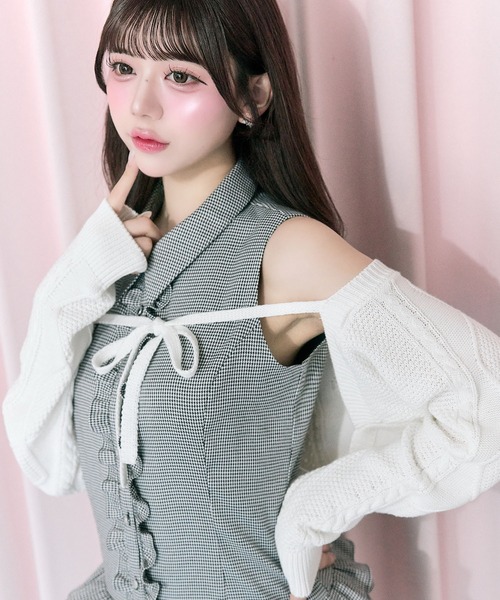 羽織るだけでこなれ感、リボンが効いたレイヤードボレロ。■デザイン・フロントの華奢なリボンがポイント。・ざっくり編みのニット素材で程よい抜け感を演出。・肩を落としたシルエットでトレンドライクに。・ワンピースやトップスに重ねやすい短丈バランス。■カラー・オフホワイト/ブラウン/ブラックの3色展開■スタイリング・Nosleeve Frill Onepiece (品番:1161090020)と合わせてセットアップ風に着るのがおすすめ。・フェミニンコーデの引き締め役としても活躍。・カップ付きインナーやキャミワンピと合わせても◎--------------------裏地:なし光沢感:なし透け感:なし伸縮性:あり手洗い:可能タンブラー乾燥:不可アイロン:110℃以下--------------------model:165cm■お気に入り登録のおすすめ【気になるアイテムを登録】ハートをクリックしてお気に入りに登録すると完売カラーの再入荷やラスト1点の通知、セールの通知を受けとることができます。【ブランドを登録】新商品や再入荷、セール通知など、いち早くブランドの情報を受けとることができます。