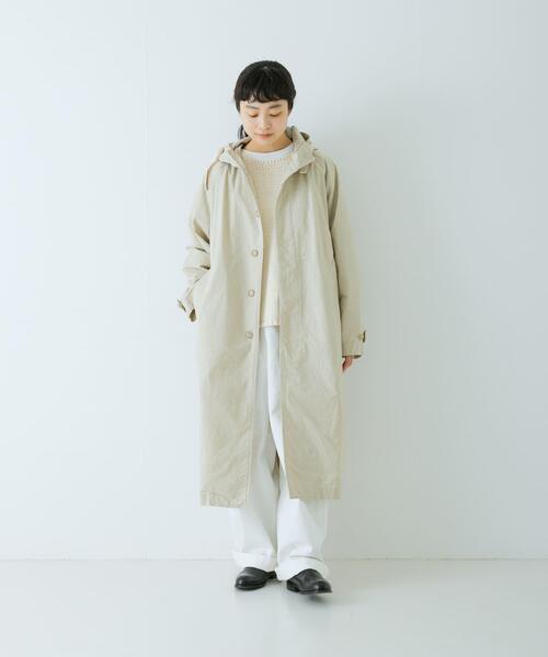 天然素材の風合いとシルエットが魅力的ゆったりとしたサイジングが雰囲気溢れるアウター。風合いが感じられる生地は、程よいハリがどこか品のある表情。フードの大きさが絶妙で大人のカジュアルスタイルに馴染みます。袖はラグランスリーブで着やすく、身幅はワイドですが大きく見えすぎないパターンを採用しています。ボタンは上2つだけ見える仕様。下は比翼仕立てでミニマルな印象に。シンプルすぎない加減が大人の着こなしに差をつける1枚。寒さ残る時期にはニットを、春先にはブラウスやカットソーを重ねて。気温に合わせてインナーで調節が利き長くお楽しみいただけます。【FABRIC】・合わせやすいカラー展開・軽やかな1枚仕立て【POINT】・両サイドにはポケット付き・フードに通してあるリボンがさり気ないアクセント【2026 Spring/Summer】【26SS】※この商品は、はっ水(水をはじく)加工を施してあります。防水ではありませんので強い雨にご注意ください。※小ロットによる特殊な染色と乾燥を行った生地を使用しています。生地の色ムラやシワ感が特徴となりますのでご了承ください。※その他お取り扱いに関しましては、商品に付属のアテンションタグをご覧ください。総重量 : 約670g※商品画像は、光の当たり具合やパソコンなどの閲覧環境により、実際の色味と異なって見える場合がございます。予めご了承ください。※商品の色味の目安は、商品単体の画像をご参照ください。▼お気に入り登録のおすすめ▼お気に入り登録された商品は、マイページにて現在の価格情報や在庫状況の確認が可能です。お買い物リストの管理にぜひご利用ください。素材感透け感 : なし伸縮性 : なし裏地 : なし光沢 : なしポケット : ありFREE