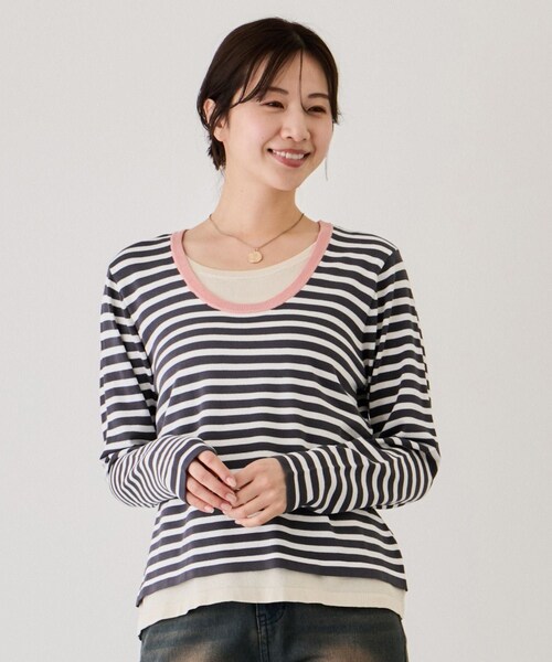 【デザイン・シルエット】 ・レイヤード風デザイン:首元や裾から別色のニットが覗くフェイクレイヤード仕様。一枚で重ね着風スタイルが完成し、コーディネートに奥行きをプラスします。 ・絶妙な配色バランス:ボーダー柄に映える襟元のアクセントカラーが、顔まわりを明るく演出。シンプルながらも都会的で洗練された印象に導きます。 ・スッキリとした美シルエット:体のラインを拾いすぎない程よいゆとりに、編み地の縦ラインが全体をシャープに見せ、スタイルアップ効果も期待できます。 ・着回しやすい丈感:短すぎず長すぎない絶妙な丈設定で、タックイン・アウトどちらもバランス良く決まります。 【素材感】 ・なめらかなレーヨン混素材:レーヨン80%、ポリエステル20%の混紡素材を使用。しっとりとなめらかな肌触りで、快適な着用感をキープします。 ・きれいめな編み地:程よい厚みと上品な表面感で、カジュアルになりすぎず、大人の装いにフィットします。 ・ロングシーズン対応:適度な肉感のニット素材で、季節をまたいで長く活躍する万能アイテムです。 【カラー】 09 グレー 14 シロ 82 イエロー 【スタイリングポイント】 ・きれいめカジュアル:スラックスやナロースカートと合わせれば、配色デザインが映える洗練スタイルに。 ・大人のこなれ休日コーデ:デニムやワイドパンツと合わせて、ニットを主役にしたリラックス感のある都会的な着こなしもおすすめです。 ・ジャケットインにも最適:襟元の配色がVゾーンのアクセントとなり、ジャケットやアウターのインナーとしても存在感を発揮します。 裏地:なし 光沢感:なし 透け感:なし ポケット:なし 伸縮性:あり 生地の厚さ:普通 ボタン:なし その他仕様:なし 季節:春秋冬 ※撮影時の光、お使いのモニター環境によって色の見え方が違う場合がございます。予めご了承ください。 モデル身長:172cm 着用サイズ:F