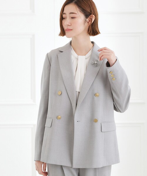 ニュートラルに洗練された シーンレスWブレストジャケット 【デザイン】 知的で端正な印象の Wブレストジャケット。 肩からウエストにかけて自然に沿うボクシーシルエットを、立体的に設計した3面体構造で実現。 フロントはメタル調ボタン開き、袖口もメタル調ボタンでアクセントに。 すっきり細めのラペルラインがシャープな顔まわりを演出し、全体の印象をより洗練されたものにします。 袖口は折り返してもサマになり、スマートで知的な着こなしが可能です。 【素材】 シャークスキン織のポリエステル素材を使用。 柔らかく落ち感がありつつハリも兼ね備え、立体感のあるシルエットを美しくキープ。 ストレッチ性があり動きやすく、シワになりにくいので長時間の着用でも端正なラインを保てます。 【スタイリング】 同素材のテーパードパンツ(768-65006)や、ワイドパンツ(768-65005)、 デザインブラウス(768-85001)とセットアップで、セレモニーやお仕事シーンにも対応。 単品でもスカートやデニムと合わせやすく、オンオフ問わず幅広く活躍する知的で洗練されたジャケットです。 ※同素材シリーズ 768-65006(テーパードパンツ) 768-65005(ワイドパンツ) 768-85001(デザインブラウス) 【仕様】 ・ポケット数:横×2 ・裏地:総裏仕立て ※照明の関係により、実際よりも色味が違って見える場合があります。また、パソコン・スマートフォンなどの環境により、若干製品と画像のカラーが異なる場合もございます。 【26SS】 モデル情報:身長166cm B80 W59 H86 着用サイズ:02(M) 店舗へのお問い合わせ商品番号:768-45010 ●製品寸法: 01(S):着丈63cm B93cm 袖丈58cm 肩幅37cm 02(M):着丈64cm B96cm 袖丈59cm 肩幅38cm 03(L):着丈65cm B99cm 袖丈60cm 肩幅39cm 04(LL):着丈66cm B102cm 袖丈61cm 肩幅40cm 05(3L):着丈67cm B105cm 袖丈61cm 肩幅41cm 備考:重量:約475g(サンプルサイズ)