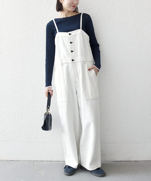 【26SS】 〈デザインポイント〉 いつものTシャツやニットに合わせるだけで、一気にオシャレ見えが叶うサロペット。 フロントのボタンや大きめのパッチポケットでワーク感がありながら、華奢なストラップやワイドストレートのパンツシルエットで大人っぽく着こなせます。 バイカラーのステッチやボタンが映えるオフホワイトと、ワントーンのネイビーの2色展開。 ショルダーストラップは長さ調整可能で、インナーの厚さを選ばずオールシーズンお使いいただけます。 〈生地・素材のポイント〉 ・家庭洗濯可能(洗濯機OK) 柔らかさと軽さが魅力の綿麻素材を使用。 カルゼ織りのほんのりとした斜めの綾目が、表情豊かな印象をプラスしてくれます。 〈コーディネート・その他〉 長めの丈でゆるっと着る時はスニーカー、少し短めの丈で着る時はヒールサンダルや靴下合わせのローファーなど、肩紐の長さに合わせて足もとをチェンジすると◎ スカーフやボーダーを合わせて今季らしいマリンルックもオススメです。 フロントのボタンを少し外すと抜け感が出てこなれた印象に。 ------------------------------------- 生地の厚み:中間 伸縮性:やや有 透け感:無(オフホワイトはやや有) 光沢感:無 水洗い:洗濯機可 ------------------------------------- ※素材の特性上、表面にネップ(部分的に太くなっている)やスラブ(太さにムラがある)などの糸ムラがあります。 ※濃色製品は、着用、洗濯時のスレで表面が毛羽立ち白っぽくなる場合がありますのでご注意ください。 ※濃色製品は、汗や雨等の水分や摩擦により、他の衣類に色移りする場合がありますので、淡色衣類との組み合わせはご注意ください。 ※屋外での撮影画像は、光の当たり具合で色味が多少異なって見える場合があります。商品の色味は、スタジオでの詳細画像をご参照ください。 ※末永く愛用頂く為に、アテンションタグ・洗濯ネームを必ずご確認の上、着用又はお取り扱い下さい。 ※画像の商品はサンプルです。 実際の商品と仕様、加工、サイズが若干異なる場合がございます。