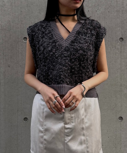 トレンド感を纏う、ボリュームシルエットのニットベスト【Point】テープヤーンにフリンジや短毛フェザーをMIXし、春夏らしい軽やかさの中に表情豊かな編地を取り入れたニットベスト。立体感のある編地が、シンプルながらも存在感のある一着です。深めのVネックと程よいショート丈が、すっきりとした大人の印象を演出。ショート丈ながらも身幅にゆとりを持たせることで、リラックス感のある抜けたシルエットに仕上げました。襟元と裾に施した太めのリブが、全体を引き締めるアクセントに。ウール不使用の素材を使用しているため、チクチク感がなく快適な着心地。インナー次第で、ロングシーズン活躍するアイテムです。【Styling】・存在感のあるトップスなので、シンプルなボトムとの合わせが好相性・女性らしく着こなすなら、タイトスカートがおすすめ・クールに仕上げたい日は、ナイロンパンツやトラックパンツなどワイドシルエットと合わせて・シンプルなワンピースの上にレイヤードするだけでも、着映えスタイルが完成----------------------------------------------------【Detail】・肩幅広め×立体シルエットで気になる二の腕をさりげなくカバー・微配色でまとめたデザインは、コーディネートに取り入れやすく着回し力◎・インナー次第でロングシーズン活躍透け感/なし光沢感/なし伸縮性/あり生地の厚さ/やや厚め----------------------------------------------------※撮影場所により、実際の色味と若干異なる場合がございます。またパソコン・スマートフォンなどの環境により、若干製品と画像のカラーが異なる場合もございます。予めご了承ください。※商品画像はサンプルのため、色味やサイズ等の仕様に変更がある場合がございますので、予めご了承ください。----------------------------------------------------【お買い物を楽しんで頂く為に】■商品のお気に入り登録お気に入りの登録をして頂きますと完売カラーの再入荷通知や、ラスト1点の通知を受け取ることができます。■ブランドのお気に入り登録新商品の発売や再入荷、タイムセールやクーポン発行のお知らせなど&g'aimeがお届けするお得な情報を受け取ることができます。
