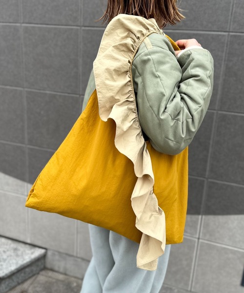 ドッキング配色フリルBigトート 配色フリルのついた大きなトートバッグ。 贅沢に生地の用尺を使ったベース生地には、しっかりめのナイロン生地。 配色のフリルには動きのでる柔らかい異素材をドッキング。 片面はフリルでは無く、ワンポイント:CATロゴネームがついて、どちらの面でもカワイイ。 Vintageライクな、レトロな雰囲気のネコロゴネームがついてポイントに。 今日1日を大切にする!今この瞬間を最大限に活かす!という、 “Seige the day” 猫のゴロゴロ音(Purr)と素晴らしい(Brilliant)を組み合わせた造語 #purrilliant のロゴ。 コーデ次第で、使いわけても◎ メイン使いはもちろん。 トレンドのミニバッグと一緒に、サイドバッグやエコバッグとしても◎ A4サイズ収納可能な大きさです。 ショルダーバッグとして、肩がけ時も、ホールがゆったりで◎ 腕にかけて、可愛さUP! オールシーズン、デイリーに使える万能バッグです。 ブラック×グレーフリル、マスタード×ベージュフリル、カーキ×蛍光グリーンフリル の3色展開です。 内側もカワイく、裏地も配色です。 【Information】 ◆《お気に入り登録》がオススメ◆ ・「商品のお気に入り登録」で再入荷通知や、ラストの通知、セール通知も受け取ることが出来ます。 ・「ブランドのお気に入り登録」で新商品や再入荷など、お得な情報を受け取ることが出来ます。 ※撮影時のライティング、ご覧になっているモニター・PC環境により、実際の商品と色味が異なって見える場合がございます。予めご了承をお願い致します。 ※他のキャンペーンにより、期間中に価格が変動する場合があります。 ※セールは予告なく終了させていただく場合もあります。 ※ご注文いただいた予約商品のお届け時期の確認は、注文履歴ページより行えます。