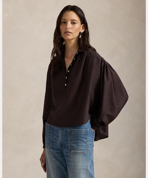 軽くプレスしたプリーツでディテールを添えたシャツ。コットンとマルベリーシルクの混紡素材で織り上げ、ゆったりとした流れるような形を演出。・リラックスフィット / 腰丈。・スプレッドカラー / ボタン付きハーフプラケット / 長袖のブルゾンスリーブ、シャーリング入りのボタン付きカフス。・ヨーク、肩、袖にプリーツ / 後ろが長いラウンド型にカーブした裾。・Ralph Laurenのコットン製品を選ぶことで、環境の保護と修復に努めながら、コットン業界が今後も成長を続けられるように支援するBetter Cotton™ミッションへのRalph Laurenの取り組みをサポートすることになります。・本商品は物質収支方式に則って材料を調達しているため、全ての製品にBetter Cotton™が含まれない可能性があります。物質収支方式について詳しくは、bettercotton.org/massbalanceをご覧ください。・モデル身長178cm、着用サイズS。※商品の色味は、光のあたり具合など諸条件により色感が多少異なって見える場合がございますので予めご了承下さい。※ラルフ ローレンのシャツは、袖口がまくられた状態で納品され、そのままの状態で保管されている場合があります。デザインや商品特性を活かす為に、あえてこのような工夫をしておりますので、予めご了承ください。ポロ ラルフ ローレン