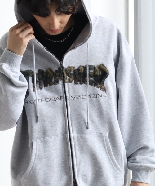【THRASHER/スラッシャー】裏毛 ロゴデザイン ジップアップパーカー※Sサイズのみショート丈デザイン※