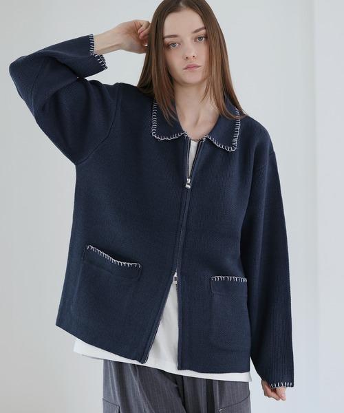 ■アイテム説明襟、袖口、ポケットの縁取り刺繍デザインがアクセントとなったニットポロ。メタリックな刺繍糸の束でブランケットステッチを施し、こなれた印象をプラスしました。ゆとりのある身幅にドロップショルダーがリラックス感を演出しつつ、襟付きのポロシャツデザインにすることでカジュアルすぎない品のある印象にまとめてくれます。フロントはダブルジップ仕様で、ファスナーの開き具合で着こなしの幅が広がるのも嬉しいポイント。ユニセックスで着用可能なので、男女問わず旬のコーディネートをお楽しみいただけます。■素材肌当たりの優しいアクリル100%のニット素材を使用しました。柔らかな肌触りと程よい厚みがあり、季節の変わり目にも快適に着用いただけます。■コーディネート落ち着いた色合いのチャコール、グレイッシュベージュ、ブルーの3色展開。ルーズなシルエットに合わせてボトムスもワイドな物を合わせると好相性。キレイめなシャツなどとレイヤードさせることで今っぽい着こなしでご着用いただけます。▼商品詳細透け感:なし裏地:なし光沢:なし伸縮性:あり▼推奨サイズ S:~165cm M:165cm ~ 172cm L:172cm ~ 178cm XL:178cm ~<モデル着用サイズ>女性モデル:173cm|Mサイズ※縁部分にはデザイン性を活かしたステッチを施しておりますため、着用時やお取り扱いの際は引っかかりにご注意ください。※商品画像は、光の当たり具合やパソコンなどの閲覧環境により、実際の色味と異なって見える場合がございます。予めご了承ください。【お買い物をお楽しみいただく為に】▼商品のお気に入り登録完売カラーの再入荷通知や、ラスト1点の通知、セールの通知も受けることができます。▼ブランドのお気に入り登録新商品や再入荷等、いち早くブランドのお得な情報を受け取ることができます。