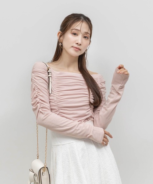◆2026SS新商品◆贅沢にギャザーをあしらったカットトップス。程よいフィット感で女性らしい印象へと導いてくれます。着心地の良い伸縮性のある素材感も嬉しいポイントです。POINT・肌触りの良いやわらかなカットソー素材・身頃と袖部分には贅沢にギャザーを入れることで、一枚で華やかな印象に・身体に程よくフィットするデザイン・デコルテを美しく魅せるネックライン・肩を落としてオフショルとしても着用可能COORDINATE一枚で華やかさがあり、スカートにもパンツにも好相性なアイテムです。キャミワンピースなどのインナーとしてもご着用いただけます。- - - - - - - - - - - - - - -洗濯方法:手洗い可透け感:ややあり裏地:なし伸縮性:ややあり生地の厚さ:普通- - - - - - - - - - - - - - -