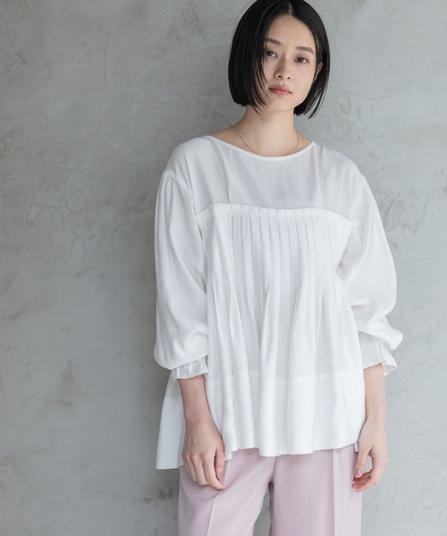 セレモニーやオケージョンから、日常のお仕事使いまで!1枚着映えブラウス!ーーー胸元にたっぷり入ったタックデザインがポイントの長袖ブラウス。ペプラムシルエットで、スタイルアップが叶います!ーーー【デザインと特徴】1枚着映えデザインなので、セレモニーやオケージョンから、日常のお仕事使いまで幅広く活躍するブラウス。・着脱は後ろ中心開きのかぶり仕様・レイヤードをしているかのような1枚で映えるデザイン・ウエストからタックが開いて、裾回りのフレアにたっぷりボリュームをもたせることにより ペプラムシルエットになっており、寸法的にはゆったりして楽に着られますがスタイルアップしてみえます・袖口はゴム入りで袖まくりしやすい仕様です【素材特徴】・とろみがあり肌触りのよい質感・ふっくらとしてやわらかい生地感【お手入れ方法】洗濯機でお洗濯していただけます。【スタイリング】裾に向かってやや広がりのあるシルエットなので、パンツスタイルやナロースカートとの合わせがおすすめです。ジャケットのインナーとしても◎