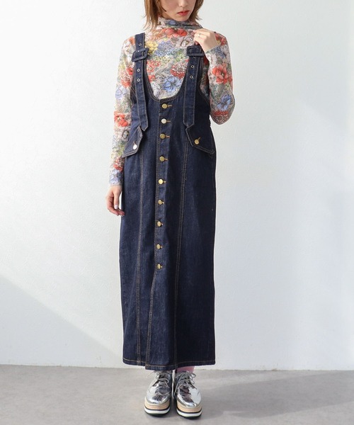 レトロ感のあるボタンデザインのデニムワンピースサロペットタイプのデザインで、インナー次第でロングシーズン着用可能です。フロントボタン仕様に加え、後ろにはスリットを入れることで足さばきの良さと抜け感をプラス。ボディラインを美しく見せるプリンセスラインを採用し、カジュアルながらも女性らしさを演出します。肩ひもは長さ調整が可能、さらに後ウエストには調整ベルト付きでフィット感を自在に調整可能。サイドにはフラップデザインのポケットを配し、実用性とデザイン性を兼ね備えた一着です。--------------------------------------透け感:なし裏地:なし伸縮性:なしケア方法:洗濯機可※お洗濯の際は洗濯表示を必ずご確認ください。--------------------------------------