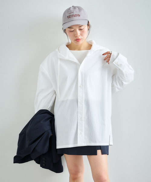 【2026SS】 U by SPICK&SPANいつものシャツスタイルに、遊び心とレイヤードの楽しみをブルゾンライクなディテールが光る、大人のフーディシャツ。 「ベーシックなシャツはすでに持っている」という方にこそ手に取っていただきたい、新鮮なデザインシャツが登場。 最大の特徴は、フードに通したあえて太めの杉綾テープ。ブルゾンのようなスポーティーなニュアンスをプラスし、1枚着でもしっかりとサマになるデザインに仕上げました。特にこだわったのは、第1・第2ボタンを開けた時の襟周りの見え方。絶妙な抜け感が生まれるよう計算されており、顔周りをすっきりと見せてくれます。 今の時期はニットやジャケットのインナーとしてフードを覗かせたレイヤードスタイルに、暖かくなれば軽い羽織りとして。着回し力の高さで、ロングシーズン活躍間違いなしのアイテムです。《スタイリング提案》春のレイヤード: 紺ブレザーやコンパクトなニットのインナーに。フードを出すだけで、トラッドな装いに程よいカジュアルさが加わります。抜け感スタイル: ボタンを少し開けて、ニュアンスたっぷりに着こなして。ボトムスはスラックスで綺麗めに、足元はサンダルで外すバランスが今季のおすすめです。**********************透け感:ややあり(ホワイト)裏地:なし伸縮性:なし光沢感:なし生地の厚さ:普通**********************※こちらの商品は、カラーによって組成が異なります。ホワイト(010):本体:綿68%、複合繊維(ポリエステル)32%ベージュ(027) :本体:綿69%、ナイロン28%、ポリウレタン3%※取り扱いについては、商品についている品質表示でご確認ください。※こちらの商品はU by SPICK&SPAN店舗での取り扱いになります。直接店舗へお問い合わせの際は、U by SPICK&SPAN店舗までお願い致します。※照明の関係により、実際よりも色味が違って見える場合があります。またパソコン・スマートフォンなどの環境により、若干製品と画像のカラーが異なる場合もございます。※商品の色味は、商品アップ画像をご参照ください。本体:手洗い可能