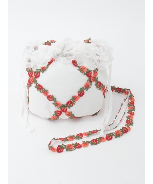 配色使いが可愛いらしいオリジナルの苺のブレードレースをあしらったポシェット。 綿ローン地にキルティング加工を施して、入りぐちにドットチュールのフリルをあしらいました。 丸みを帯びたシルエットに苺のブレードレースを格子状に飾り立てて華やかに。 入りぐちの両サイドには紐が付いていて、真ん中でキュっと結んで巾着タイプに。入りぐちが閉まるので安心して使えます。 ショルダー紐には苺のブレードレースを貼り付けて華やかな仕上がりに。 苺をモチーフにしたケミカルレースの配色使いがとても印象的。