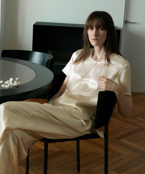 ◇26SS◇ ADAM ET ROPE' EMOELLE 【Material】 高級感のある光沢が魅力のアセテートサテン。 心地よい肌触りと、しなやかなドレープ性に優れており、ナチュラルなシワ加工も施した表情感のある素材。 【Design】 シンプルなTシャツ型のサテンブラウス。 絶妙な抜け感が漂うUネック。 体から程よく離れたシルエットで、上品な素材とエフォートレスな雰囲気が楽しめる上品な1着。 ◇同素材にて、サテンイージースラックス(品番:GAS76020)もご用意がございます。 【Color】 シックに決まるスミクロと、柔らかい印象のキナリの2色展開。 【Styling Point】 カジュアルすぎずに着られるトップス。 同素材のサテンイージースラックスを合わせたセットアップもおすすめ。 --------------- 透け感:キナリのみややあり 裏地:なし 伸縮性:なし 光沢感:あり 生地の厚さ:薄手 開き方:後ろ襟ぐりスナップボタン 洗濯方法:手洗い --------------- ◇モデル情報 詳細着用モデル:170cm size:F ※撮影時の光、お使いのモニター環境によって色の見え方が違う場合がございます。