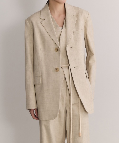 ◇26SS◇ ADAM ET ROPE' EMOELLE 【Material】 シルク混のスラブネップツイード。 タテ糸にコットンスラブ糸、ヨコ糸にシルクネップとレーヨンを撚糸した糸を用いて尾州にて織り上げた素材。 スラブとネップの凹凸感によるビンテージライクな表情が特徴。 タンブラー加工を施し、ふっくらとした風合いと程よい抜け感を演出。 【Design】 襟の形やラペルの返り位置、シルエットにこだわったシングルジャケット。 さっと着るだけで決まるサイズ感で幅広いアイテムと好相性。 ◇同素材にて、シルクネップジレトップス(品番:GAV76010)、シルクネップスラックス(品番:GAS76000)も展ご用意がございます。 【Color】 MIX感のある表情が豊かなキナリとベージュの2色展開。 【Styling Point】 同素材のスラックスを合わせてセットアップな着こなしや、デニムでカジュアルダウンさせるスタイルもおすすめ。 --------------- 透け感:なし 裏地:あり 伸縮性:なし 光沢感:なし 生地の厚さ:やや薄手 開き方:フロントボタン ポケット:あり --------------- ◇モデル情報 詳細着用モデル:170cm size:38 その他モデル着用:size38 ※撮影時の光、お使いのモニター環境によって色の見え方が違う場合がございます。