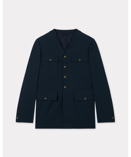 ノーカラー ミリタリージャケット リサイクル バージンウール ポリエステル ライニング付き フロントポケット×4 カフには取外し可能なラベル ショルダーにはエポレット 「Boke Flower」 のボタン モデル:身長185cm、着用サイズ:48 後身丈:79 cm この製品はスリムフィットのデザインです。よりルーズな着こなしがお好みの場合は、ワンサイズ上をお勧めします。
