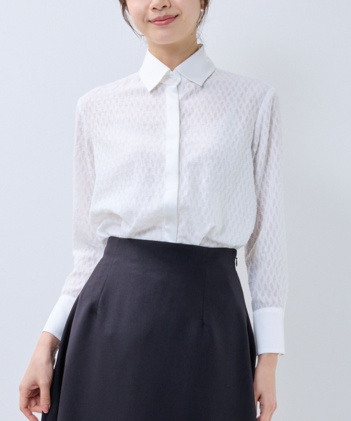幾何柄のジョーゼット生地を使用した、抜け感のある九分袖ブラウス。襟と袖にはサテン素材を配し、ビッグシルエットながら上品な印象に仕上げています。ボタンを留めてアクセサリーを合わせればセミフォーマルにも対応し、前を開けて羽織りとして着用するのもおすすめです。パンツにもスカートにも合わせやすく、オンオフ問わず着回しを楽しめる一着です。・透け感あり・ストレッチなし・カラー展開はホワイト、ブラック、ピンク・サイズ展開は1(M)9号・2(L)11号・3(2L)13号