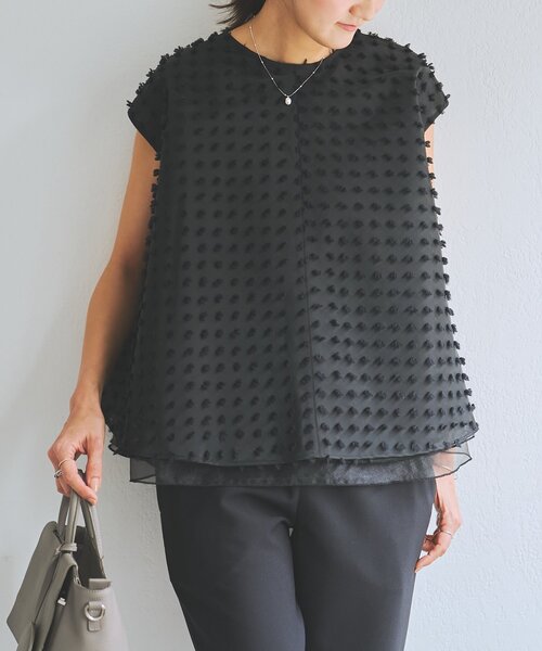 ■アイテム シアー感のある軽やかな素材を重ね、ふんわりと立体感を持たせたノースリーブブラウス。 表地には、ポリエステル×ナイロン素材のジャガード生地を使用し、ジャガードで立体的なドット柄を繊細に表現しています。 ノーカラーのすっきりとしたデザインに、前後どちらでも着用可能なボタン仕様。 Aラインに広がるフレアシルエットが、動くたびにやさしい華やかさを演出します。 着丈は長すぎず、同素材のスカートと合わせたセットアップスタイルもおすすめ。 一枚で着映えしながら、きちんと感も備えた、大人のためのフェミニンブラウスです。 ※こちらは《LIVETART》のタグがつきます。 ■素材・洗濯表示 素材 ジャガード部分:ポリエステル56% ナイロン44% 無地部分:ポリエステル100% 洗濯表示:ドライクリーニング ※着用時・洗濯時は、必ず取扱い表示・タグをご確認の上、お取り扱い下さい。 ---------------------------------- 伸縮性:なし 光沢:若干あり 厚み:うすい 透け感:あり 裏地:あり ポケット:なし ファスナー:なし(ボタン仕様) ---------------------------------- 《LIVETRT/リヴェタート》 BEARDSLEYのインブランドLIVETART(リヴェタート) 美しい刺繍やレース、しなやかなフォルム、鮮やかな色彩、大胆なプリント。 アートに触れるような心地よい緊張感であらたまった場所へも気負いなく身につけられる。 日常と非日常をつなぐ、いつもより少し高揚感に包まれる服。 ▼ブログでご紹介 《お取り扱い上のご注意》 ・タンブル乾燥不可 ・この素材は摩擦(特に湿った状態での摩擦)や汗、雨などで濡れた時は他の衣料や下着に色が移る場合がありますのでご注意下さい。 強い力がかかると、滑脱(縫い目が滑って開いたり、縫いしろが抜ける)したり目寄れ(織り糸が滑って片寄り、織り目が開く)することがあります。着脱や洗濯の際は、引っ張ったり引っ掛けないようご注意ください。 ・着用時にベルト・バック・アクセサリー・周囲の壁など、表面の粗いものとの摩擦や、引っかかりにご注意ください。 ・クリーニングは専門店にご相談ください。他のものとの引っ掛かりにご注意ください。 《予約商品について》 ・サンプルの為、素材情報、洗濯表示については企画段階の情報を記載しております。公的機関での試験データ結果を受け、量産にあたり混率や洗濯方法の変更が発生する場合がございますので、ご了承くださいませ。 ・サンプルでの撮影、計測をしております。商品の仕様が一部変更になる場合がございます。 ・撮影サンプル品はブランドタグがついておりません。製品にはタグがつきますので、製品の表に縫い糸が見える場合がございます。 ・工場の生産の都合上、納期が変更になる場合がございます。検品や輸送の関係で、発送日が前後しますのでご了承ください。また、入荷状況により、お客様への発送が店頭販売より遅れる場合もございます。 ・店頭に陳列していた商品も含まれる場合がございます。 《商品画像について》 ご覧頂いている商品の写真につきましては、できるだけ実物の色に近くなるように努めておりますが お使いの環境(モニター、ブラウザ等)の違いにより、色の見え方が実物と若干異なる場合がございます。 予めご了承ください。 《ハートをタップして商品のお気に入り登録》 【ハートをタップ】登録カラーの商品の「残りわずか」「再入荷」「値下げ」通知を受け取ることができます。 【各ショップアプリにてブランドフォロー】 新商品などの入荷情報、最新のニュースやお得な情報を受け取ることができます。 前後着用可 前後2WAY