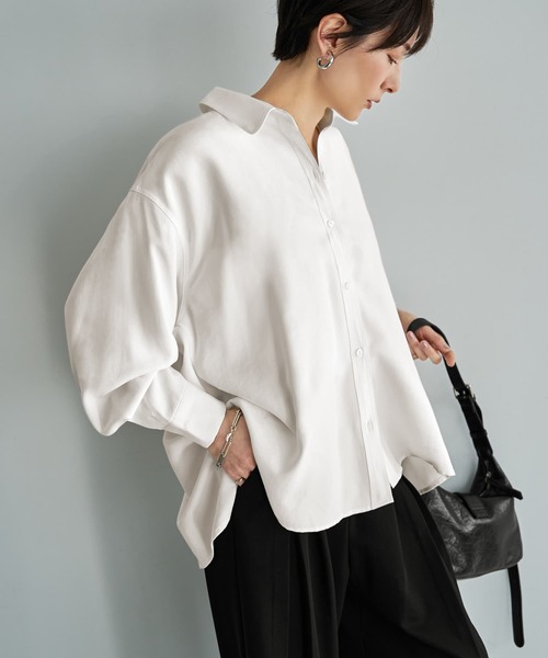 着たときの立体的なフォルムがとても素敵な、一枚でキマるオシャレ白シャツ。湿度のようなしっとりとした触感にサラッとしたハリ感が共存した、表現のし難い、だけどオシャレでお薦めな生地を使用しています。 ◆身幅が大きくゆったりとした構造。その生地量とハリ感が生む動きや立体的なフォルムが魅力。 ◆シャツ生地としてはしっかり感があり、寒い時期に着ていても寒々しさが無いタイプ。中に薄手のタートルを入れるなどインナー合わせをすれば、寒い時期から活用できます。 ◆他のシャツとの違いは、生地が変わっているところ。ニットなどの下に着ることは想定しておらず、これを主役として着こなすことにフォーカスしている点、裾をアウトで着るのが基本のデザインになっている点が異なります。 ◆生地にハリ感があるため、首元のボタンを開けた着こなしもカッコよくキマります。襟もキレイに立ちます。 ◆白シャツとしては透け感がほぼ無く、ベージュや薄いブラウン系など、透けにくい色の場合は皆無。 ◆素材の雰囲気と合わせた真っ白ではない白さもコダワリの特徴。これによりオフィス感や真面目感あるいはコンサバ要素がなく、カジュアルアイテムとの相性も高まる振り幅の広さが生まれます。キレイめコーデに使用する場合は、こなれた雰囲気をプラスできます。 ◆暖かさ:一般的な白シャツよりは若干暖かい程度。 ◆裾:前後の丈感に差を付け、背面のタックを使い、少しテントラインのような立体感が出るよう設計されています。 ◆羽織り使用:前を開けて羽織りのように着ることを考えたデザインではありませんが、構造的には可能です。 ◆シワ:多少はできますが気になるほどではなく、もしも気になる場合は霧吹きをかけて手指で軽くシワを伸ばし、ハンガーに掛けておけばOKです。洗い後に干す際は、なるべくシワを伸ばして干すようにしてください。 【その他の仕様】 ◆着用時期:10-5月頃が目安 ◆サイズ感:ゆったりとしたサイズ感 ◆丈感:ヒップが隠れる程度 ◆シルエット:身幅がワイドなストレート ◆首元:シャツ襟 ◆肩幅:問わないタイプ ◆アームホール:広い ◆袖幅:広い ◆袖丈:長袖 ◆袖口:カフス+ボタン1個あり ◆厚み:シャツとしてはしっかりめ ◆柔らかさ:ハリ感としなやかさが共存 ◆肌触り:しっとり感+サラサラ感 ◆毛羽立ち:できない ◆伸縮性:なし ◆光沢感:なし ◆透け感:ほとんど無し ◆スリット:両サイド裾にあり ◆着脱:前開きボタンタイプ ◆ボタン:白蝶貝パール風ボタン ◆ポケット:なし ◆手洗い:可能 ◆アイロン:不要 ◆スチーマー:使用OK 【お色について】 ◆アイボリー:真っ白よりも僅かに深みのある柔らかなホワイト。