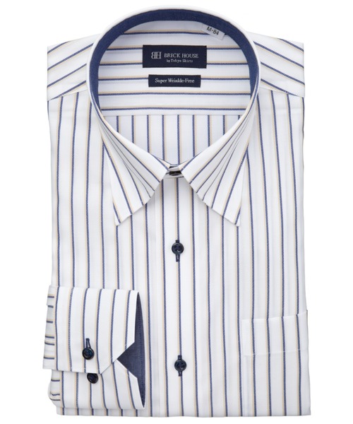 ◆ 超形態安定シャツ ◆お手入れ簡単 メンズ超形態安定シャツポリエステル混でお手入れがさらに 楽になった超形態安定シャツが登場。●高い形態安定性(W&W性)●ポリエステル混で速乾性を実現●肌ざわりやわらか着心地の良さと高い機能性を追及した 価値ある逸品をお届けします。個性的なストライプ柄の身生地に 台衿とカフス裏の別布使いに色ボタンを 取り入れ、アクセントを添えた一枚。衿先裏にスナップを付けた衿型は ボタンダウンよりもドレッシーで フォーマルシーンでも使いやすい一枚。■仕様カフリンクス使用可能な兼用カフス(アジャストボタン)角切カフス胸ポケット(左胸)付き(ホームベース型)背タック・背ダーツなし前立:裏前立仕様台衿内側・カフス裏側:別布仕様※別布を含む濃色生地は色落ち・移染が 発生する場合があるため、お洗濯時は 衣類の組合わせにご注意ください。※サイズ[首回り42cm]のお届け商品の縫い付けタグはLL表記、 サイズ[首回り43cm]のお届け商品の縫い付けタグはXL表記でございます。 ZOZOTOWNの検索サイズと異なりますのでご注意ください。【BRICK HOUSE by Tokyo Shirts / ブリックハウス バイ トウキョウシャツ】業界トップ水準を誇るノーアイロンの形態安定加工は自宅で洗濯可能でお手入れ簡単!高度な縫製技術を用いた高付加価値シャツでありながら選ぶことを気軽に楽しめます。ベーシックから多様なデザインまで幅広いバリエーションで豊富なサイズ展開で、ディテールの隅々にまで織り込んで一枚一枚丁寧に仕立てられたシャツです。