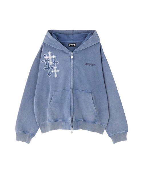 SUPPLIER 前後の身頃にあしらわれたクロスロゴが目を惹くジップアップパーカー。 SUPPLIERのシグネチャーデザインの一つである『CROSS LOGO』を飾ったアイコニックなデザイン。 シルバーとブラックのラインストーンを用いた立体的な仕上がりで存在感抜群です。 フロントの左胸にはボディと同系色の刺繍、ジップトップにはクロスロゴモチーフをあしらい、前後それぞれこだわりが凝縮しています。 420ゲージ裏毛生地をベースにしたほどよく厚手でタフな素材感はシーズンレスに活躍する一着。 程よいオーバーサイズ感でユニセックスで使いやすいシルエットに設計。フロントジップ仕様でライトアウターとしても着用がしやすく、ルーズシルエットやダメージ入りのデニム、カーゴパンツなどを合わせることでよりトレンド感のある着こなしが愉しめます。 SUPPLIER・・・世界中のストリートカルチャー震源地として、アジア、ヨーロッパ、南アフリカ、アメリカ問わず50以上のブランドを流通させ、ボーダレスに今[ここ]で起き続けるカルチャーを皆様のお手元まで供給する日本発のストリートカルチャープラットフォーム。