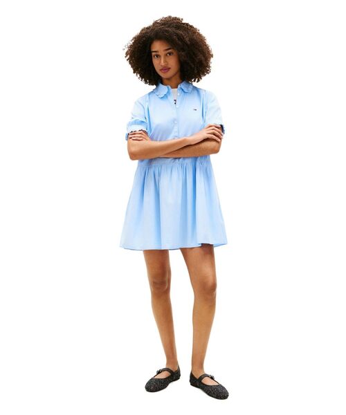ラッフルシャツワンピースガーリッシュなスタイルが楽しめる、ラッフルを効かせたシャツワンピースです。暑い時期に最適のショートスリーブデザイン。ローウエストで切り替えたスカートラインは、細やかなギャザーを入れて広がりを出しました。さらっとしたコットン素材で、快適な着心地です。ソックスとローファーに合わせた、プレッピーなスタイリングがおすすめ。※モデル画像はサンプルで撮影しているため、実際の商品とデザインや仕様が異なる場合がございます。【サイズ】XS:総丈84cm 身幅52.5cm 肩幅44cm 袖丈21cm ウエスト107cmS:総丈84.5cm 身幅55.5cm 肩幅46cm 袖丈21.5cm ウエスト110cmM:総丈86cm 身幅58cm 肩幅47.5cm 袖丈21.5cm ウエスト118cm【TOMMY HILFIGER】永遠のアメリカンクラシックをベースにモダンなひねりを加えたデザインが人気のトミーヒルフィガー。都会的で洗練されたメンズ・ウィメンズに加え、チルドレン、ゴルフライン、そしてよりカジュアルなデニムラインと豊富なカテゴリーが揃うグローバルブランド。