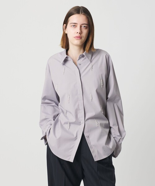輝くビーズフリンジが主役。きれいに着こなすレギュラーカラーシャツ■デザイン手付けのビーズフリンジを施した、華やかなレギュラーカラーのシャツ。シンプルなボディは、程よくゆとりがあり、きれいめに見えつつこなれ感のあるサイズ感にこだわりました。大小のビーズでイレギュラーな長さの表情豊かなフリンジを作り、動くたびに揺れ動くきらめきが目を引く一着です。■素材適度なハリのあるコットンポリエステル素材。カジュアルなコットンの風合いも残しつつ、シャキッとしたフラットできれいな表面感が魅力です。■コーディネート一枚で存在感のあるデザインシャツ。ジャケットインでフォーマルな装いから、カジュアルなアウターを上品に格上げするスパイスとしても活躍いただけます。ボトムにインすることで、ウエスト部分に揺れるビーズをアクセントとして取り入れるのも素敵です。============================裏地:なし透け感:なし伸縮:なし光沢感:ややありケア方法:手洗い可============================【注意事項】※商品に「取り扱い上の注意書き」、「洗濯表示」がございます場合は、使用前に必ずご確認ください。※商品画像は、光の当たり具合やパソコンなどの閲覧環境により、実際の色味と異なって見える場合がございます。あらかじめご了承ください。※商品の色味の目安は、商品単体の画像をご参照ください。※画像の商品はサンプルです。実際の商品と色味、仕様、加工、サイズ、素材等が若干異なる場合がございます。店舗へお問い合わせの際は、全国のUNITED ARROWS各店舗まで下記の品名/品番をお申し付けください。品名:AM C/P BEADS FRINGE SHT 品番:87111620001
