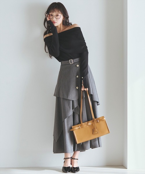 動くたびに表情を変える、ドラマティックなレイヤードフレアスカート【Design/Styling】・アシンメトリーに重ねたレイヤードデザインが視線を惹きつけ、立体感のあるシルエットを演出するスカート。・フロントにあしらったゴールドボタンと共布ベルトが、ウエストラインを引き締めつつ上品なアクセントを添えます。・たっぷりと分量感のあるフレアシルエットながら、縦のラインを意識したデザインで甘くなりすぎず、洗練された印象に◎・ウエストバックはゴム仕様でフィット感があり、着心地も快適です。・ブラウスをインしたフェミニンな着こなしはもちろん、コンパクトなニットやカットソーを合わせたモード寄りスタイルもおすすめです。・主役級の存在感で、コーディネートを格上げしてくれる一着です。・S、Mの2サイズ展開なのも嬉しいポイント!・左ファスナー仕様。【Fabric】・無地は伸縮性のある素材を使用し、程よい落ち感と快適な穿き心地を両立♪・ストライプはしなやかさがあり、動きに合わせて美しいドレープを描きます。・シーズンレスで活躍し、きれいめにもデイリーにも取り入れやすい素材感です。・ベージュ、グレーストライプ、ブルーグレー、ネイビーストライプの4色展開となります。【Care】ドライクリーニングM:(02):着丈88cm/ウエスト66cmS:(01):着丈85cm/ウエスト63cm