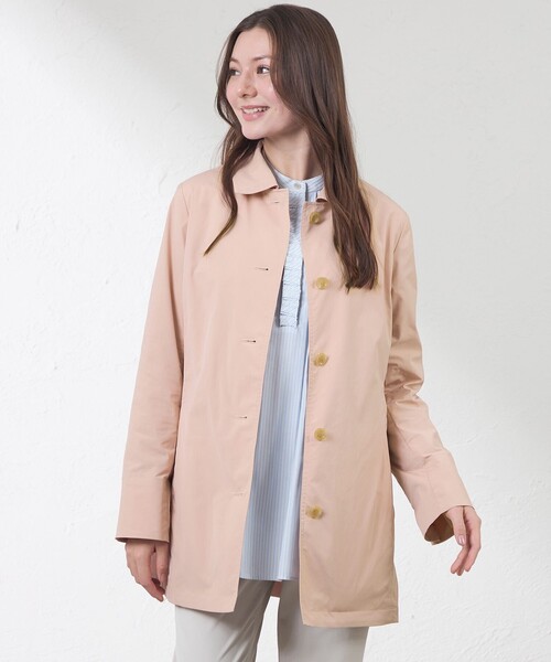 3WAYで着回す、春のステンカラーコート【デザイン】定番人気のステンカラーコートです。内ポケットにフードが収納できる仕様になっており、ステンカラー・フード付き・ノーカラーの3WAYで着用可能なスプリングコートです。より美しいシルエットと快適な着心地を実現しました。【素材】ストレッチ性のある高密度メモリータフタです。タテ糸にハイマルチの糸を使用することで程よいハリ感と滑らかな風合いを表現しています。形状記憶の特性により、ステンカラーコートならではのきれいなシルエットをキープ。さらに、マットな光沢感が上品さを演出します。春先に嬉しい機能性を備えた万能アウターです。別注加工で撥水+花粉対策の加工を施しております。機能:撥水・花粉対策※この商品はサンプルでの撮影を行っています。実際の商品とイメージ、仕様が異なる場合がございます。