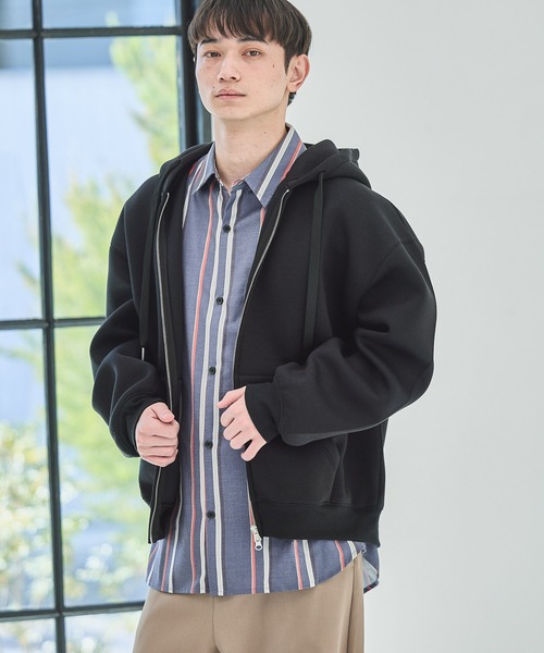 柔らかくやや厚手素材のパーカー。ハリがあるのでフードの立体感がきれいに出ます。ダブルジップ仕様なので開け具合でインナーの見え方に変化をつけたり自分なりのアレンジも。ゆとりのあるシルエットでリラックス感のある着こなしができます。【素材】柔軟性があり肌触りが良く羽織りやすい素材。【スタイリング】シンプルでワントーンのデザインなので合わせるアイテムを選びません。デニムやカーゴパンツなどカジュアルスタイルに合います。