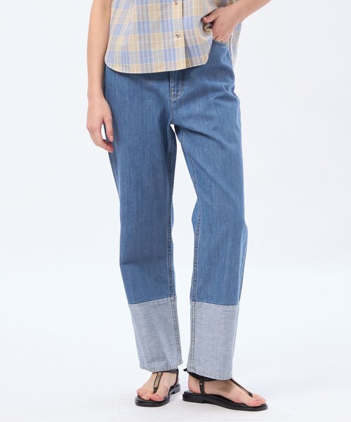 裾をターンバックしたようなカラーブロックがポイントになったストレートシルエットデニム。やや短め丈にすることで、抜け感もありすっきりした足元にみせてくれます。同素材のジャケットとのセットアップコーディネートもおすすめです。【素材】シルケット加工により生地表面が平らになり光沢が得られ、ソフトな手触りと高級感があります。綿麻素材のため着心地が柔らかく、染色しやすいことから発色も良いのが特徴です。おすすめ着用期間:春/夏/秋※34サイズはオンラインストア、ルミネ新宿店、柏高島屋ステーションモール店、ジェイアール名古屋タカシマヤ店、山形屋店、博多阪急、阪神梅田本店のみでのお取扱いになります。※この商品はサンプルでの撮影を行っています。実際の商品とイメージ、仕様が異なる場合がございます。