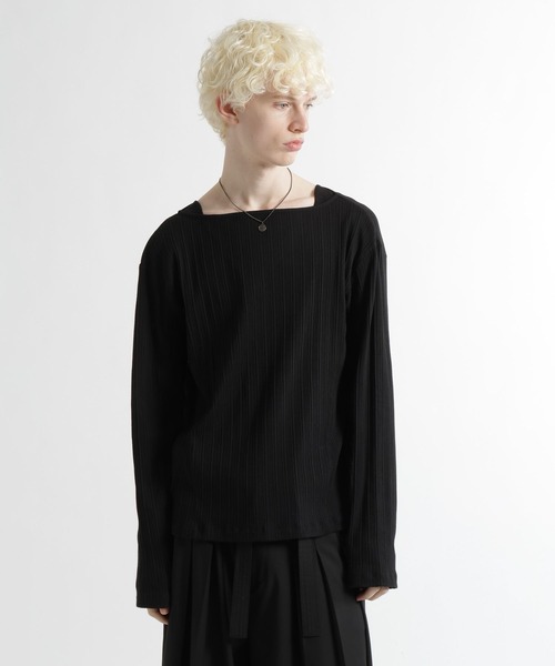 ーーー ランダムな凹凸感が奥行きを生むリブ生地と、抜け感のあるボートネックが調和した、上品なリラックストップス。 ーーー DESIGN 首元はデコルテを美しく見せる、程よく抜け感のあるボートネックを採用し、上品で大人な印象に仕上げました。 切り替え部分にはさりげなくステッチワークを施すことで、ミニマルなデザインの中にアクセントを加え、単調にならない表情豊かな一着に。 シンプルながらも計算されたシルエットで、一枚着としてもインナーとしても様になる万能アイテムです。 MATERIAL 表面に不規則な凹凸を持つランダムリブ生地を使用することで、無地ながらも奥行きのある表情を生み出しています。 程よい伸縮性を備えているため動きやすく、ストレスフリーな着心地と上品な見え方を両立した素材感です。