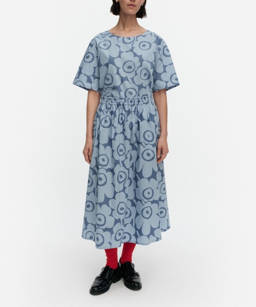 【ASIA EXCLUSIVE】アジア限定【テキスタイルデザイン:Maija Isola(マイヤ・イソラ)】 Unikko(ウニッコ):花いつもの着こなしがロマンティックに一新するUnikko柄のフレアスカート。きれいめなブラウスはもちろん、Tシャツと合わせてカジュアルダウンさせても小粋なスタイリングに。さらりとした肌ざわりも快適な一枚。※品質表示は、Marimekko社の付けた洗濯表示を日本国内の基準に合わせ付け替えております。本国のタグはカットされておりますので、予めご了承ください。※断裁により商品ひとつずつの柄の出かたが異なるため、表示画像のディテールと多少異なるデザインのものが届く場合がございます。予めご了承ください。モデル着用サイズ:M/038/004