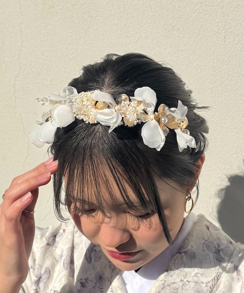 ボリューム感のあるデザインが可愛いカチューシャが登場!結婚式や二次会などのオケージョンシーンにオススメのカチューシャです。華やかなデザインなので1つでヘアアレンジが完成します♪どんなヘアスタイルにもお使いいただけるアイテムです![Point]〇編みおろしやまとめ髪に付けるのもオススメ〇ヘアアレンジが苦手でも、付けるだけで簡単に完成