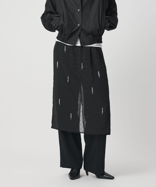 輝くビーズフリンジが主役。スタイリングを楽しむシアースカート■デザイン手付けのビーズフリンジを施した、華やかな印象のシアースカート。大小のビーズでイレギュラーな長さの表情豊かなフリンジを作り、動くたびに揺れ動くきらめきが目を引く一着です。ウエスト部分はグログラン素材で、リラックスして穿いていただけるゴムデザイン。ペチコートはウエストのスナップで着脱可能で、固定されることでずれにくい仕様となっています。■素材柔らかなシフォンジョーゼットのドビー生地を使用。フィルム糸を使用したドット柄が繊細に輝きます。■コーディネートメンズライクなブルゾンと合わせて、大人のミックススタイルがおすすめ。スタイリングのアクセントアイテムとして、パンツの上にレイヤードしても素敵です。きれいにまとめた上品なコーディネート~カジュアルダウンまで幅広くスタイリングをお楽しみいただけます。============================裏地:なし(ペチコート付き)透け感:あり伸縮:なし光沢感:ややありポケット:なしケア方法:ドライクリーニング============================【注意事項】※商品に「取り扱い上の注意書き」、「洗濯表示」がございます場合は、使用前に必ずご確認ください。※商品画像は、光の当たり具合やパソコンなどの閲覧環境により、実際の色味と異なって見える場合がございます。あらかじめご了承ください。※商品の色味の目安は、商品単体の画像をご参照ください。※画像の商品はサンプルです。実際の商品と色味、仕様、加工、サイズ、素材等が若干異なる場合がございます。店舗へお問い合わせの際は、全国のUNITED ARROWS各店舗まで下記の品名/品番をお申し付けください。品名:AM SHEER BEADS FRNG SK 品番:87241620001