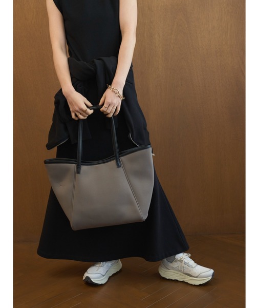 ■撥水加工(裏地) ■Design ネオプレーン素材のトートバッグ。A4が入るビックなサイズ感と軽さを追及。合皮と組み合わせることでスポーティーながら、キレイ目な印象に。しっかりとした底板を入れているので形が崩れにくいです。底板を外すことも可能。お仕事バッグやママバッグ、1泊旅行などにもおすすめです。ネオプレーンはスポンジ素材のため、雨は弾きませんが、裏地に撥水加工を施しており、荷物は濡れにくい工夫もうれしいポイント。 ※照明の関係により、実際よりも色味が違って見える場合があります。 またパソコン・スマートフォンなどの環境により、若干製品と画像のカラーが異なる場合もございます。予めご了承ください。 商品の色味は、商品単品画像をご参照下さい。 ※商品画像はサンプルのため、色味やサイズ等の仕様に変更がある場合がございますので、予めご了承ください。