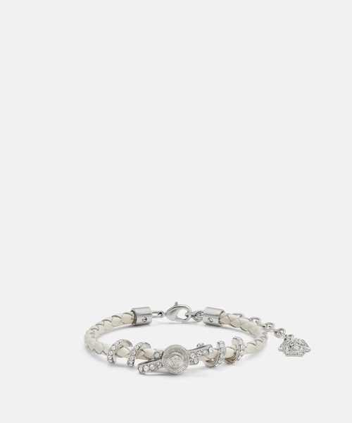 スライド式のリボンとメデューサのエンブレム、そしてアクセントのクリスタル装飾が特徴の、編み込みレザーブレスレット。 ヴェルサーチのジュエリー製品はすべて鉛とニッケルフリーです。 素材はすべて低アレルギー性です。 メデューサハードウェア ロブスタークラスプ留め
