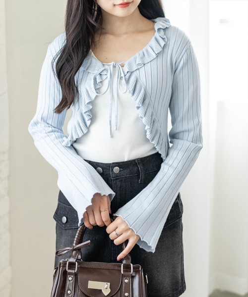 ラフに羽織れるショート丈!フリルニットカーディガン【デザイン】フロントにあしらったフリルデザインがポイントのニットカーディガンです。リブ編み素材ですっきり見えしつつ、甘さを抑えたバランスに仕上げています。ショート丈なので重たく見えず、ラフに羽織れる一枚です。【素材感】伸縮性のあるレーヨン素材伸縮性:あり/ 透け感: なし/ 裏地:なし 水洗いによる洗濯不可 / ドライクリーニング可【コーディネート】デニムやカーゴパンツと合わせて、甘さをカジュアルダウンした着こなしがおすすめです。インナーにロゴTやタンクトップを合わせれば、抜け感のあるレイヤードスタイルに。ワイドパンツやスカートとも相性が良く、デイリーコーデに取り入れやすいアイテムです。【※お取り扱い上のご注意】1:モニター環境等により実際の商品と多少色味が異なって表示される場合がございます。予めご了承下さい。2:屋外で撮影された商品は、天候により多少実際のカラーと異なる場合があります。商品のカラーはトルソー(マネキン)の商品画像をご参照ください。3:濃い色の商品は、お洗濯や摩擦等による移染にご注意ください。4:末永くご愛用頂く為に、アテンションタグ・洗濯ネームを必ずご確認の上、着用又はお取り扱い下さい。5:生産時期により、色、サイズ、デザイン、素材の質感が多少が異なる場合がございます。あらかじめ御了承下さいませ。