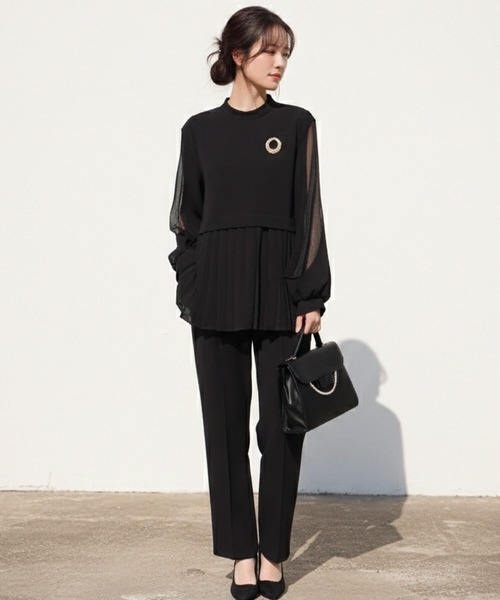 ハーフシアースリーブの切り替えプリーツトップスとピンタックパンツのセットアップ。きちんと見えするのでオケージョンシーンにも◎上品な印象なのに楽な着心地なのが嬉しいポイント。シアースリーブの程よい透け感が高級感のある仕上がりに。■サイズ(cm)・M:総丈(トップス)69 バスト102 袖丈56 肩幅35 袖口19 総丈(パンツ)100 ウエスト70-80 ヒップ108 裾幅39・L:総丈(トップス)70 バスト106 袖丈57 肩幅36 袖口20 総丈(パンツ)101 ウエスト74-84 ヒップ112 裾幅41・XL:総丈(トップス)71 バスト110 袖丈58 肩幅37 袖口21 総丈(パンツ)102 ウエスト78-88 ヒップ116 裾幅43■素材:ポリエステル100%■生産国:中国■色:ベージュ ブラック ネイビー■透け感:ややあり■生地の厚さ:普通■伸縮性:なし■裏地:あり■胸パッド:なし※お使いの環境などにより実物と色が違って見えることがございます。※実際の商品と細部が異なる場合があります。※製造過程において染色剤や接着剤の匂いが残っている場合がございますが品質上の問題ではない為、これらの理由では不良品としての返品・交換をお受けできません。◆関連ワードパンツドレス レディース セットアップ パンツスーツ 長袖 結婚式 謝恩会 発表会 かっこいい きれいめ プリーツ 大人 ママ フォーマル オールシーズン パーティードレス ドレス 大きいサイズ エレガント 上品 二次会 演奏会 同窓会 イベント シアースリーブ ふんわり ウエスト スタイル シルエット 優美 コーディネート まとまる オールシーズン ベージュ 茶色 ブラック 黒 ネイビー 紺 袖あり 膝下 オケージョン ストレスフリー 着心地 20代 30代 40代 M L XL 9号 11号 13号 yc188633