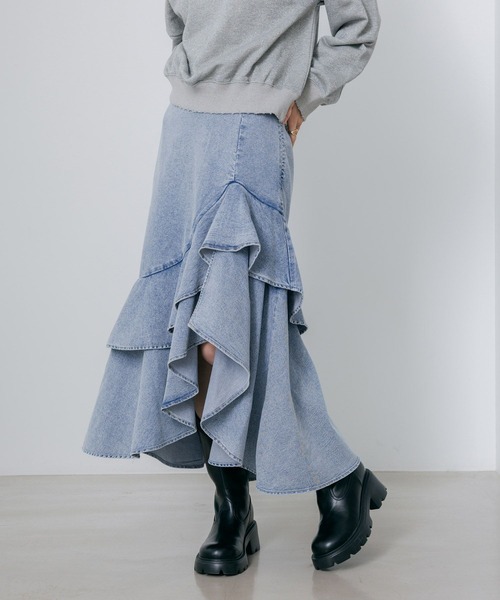 ーーー 【デザイン】 腰周りはすっきり、裾にかけてボリュームをプラスすることで 細見え&足長効果を狙えるデニムロングスカート。 ヴィンテージライクなウォッシュ加工が甘めなフリルを程よく カジュアルダウンします。 変形ヘムラインがすっきり見えを叶え、低身長さんにもおすすめな1着◎ ーーー 【スタイリング】 ボトムスのデザインが華やかなので シンプルなスウェットやTシャツ合わせでもさまになる 優秀アイテムです。 ※屋外の光や照明の当たり具合で、実際の商品と画像の色味に違いが発生する場合がございます。 ※サンプルにて撮影をしておりますので、実際の商品とは仕様や加工・サイズ等が若干異なる場合がございます。 --------------------------------------------------------- ▼気になるアイテムはお気に入り登録がおすすめ!▼ 気になる商品は♡をクリックしていただくと、 ・在庫残りわずか ・再入荷 ・セールの情報 などの通知を受け取ることができます。 ▼ブランドのお気に入り登録も!▼ 新商品や再入荷、セール、クーポンの配布など、 いち早くお得な情報を受け取ることができます。 ぜひご登録ください♪