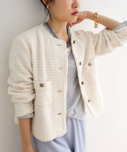 さりげなく織り込まれたリボンヤーンとラメ糸使いが上品な軽く羽織れるツイードジャケット。柔らかく伸縮性のある素材で腕回りも広めなのでストレスフリーなのも魅力。光沢を抑さえた、アンティーク風なゴールド釦もポイントに。スカートやスラックスできれいめに合わせても、ワイドボトムやデニムでカジュアルに合わせても素敵です。※取り扱いについては、商品についている洗濯表示にてご確認下さい。※照明の関係により、実際よりも色味が違って見える場合がありますまたパソコン・スマートフォンなどの環境により、若干製品と画像のカラーが異なる場合もございます。※商品の色味は、商品アップ画像をご参照ください。【注意事項】・画像の商品はサンプルです。・サイズ表記はあくまで目安となります。実際の商品と仕様、加工が若干異なる場合があります。