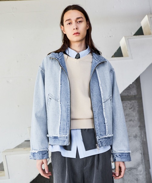 ーーー直線的な切り替えと配色ステッチが映える、スタンドカラージップブルゾン。ーーーDESIGNミニマルな構成の中にワークウェア由来のディテールを落とし込み、軽快かつ洗練されたモダンな印象に仕上げています。デニム素材特有のハリを活かし、コンパクトながらも立体感のあるフォルムをキープ。フロントZIPを軸にした縦のラインが、全体をシャープに見せます。同系色の配色ながら、コントラストを効かせた切り替えとステッチ、そして接ぎ目の切りっぱなし仕様が、シンプルな中に豊かな表情と奥行きをプラス。MATERIAL本格的なデニムの風合いと、現代的な着心地の良さを両立した混紡素材。デニムのタフな質感を残しつつ、ゴワつきを抑えたしなやかな着心地です。見た目の重厚感に反して軽さがあり、春先のアウターとしてストレスなく着用いただけます。同デザインのパンツも展開しており、上下で合わせることで、より存在感のあるセットアップスタイルが完成します。SET ITEMセットアップ対応アイテムはコチラ→【606931】
