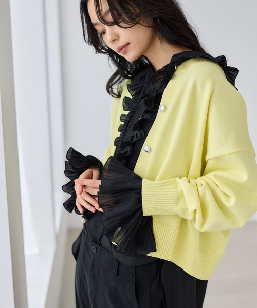 1枚で着映えする、贅沢なフリル使いのブラウス・フロントと袖口のプリーツフリルが端正なフェミニンさを表現するブラウス。・花びらのようなフリルを華やかなアクセントに・ポリエステル混なのでシワになりにくい素材【スタイリング】デニムやカジュアルボトムでこなれ感たっぷりのスタイリングがおすすめ。カーディガンを羽織ったり、サロペットのインナーにしても存在感のあるスタイリングになります。【素材】お手入れ方法:ハンドウォッシャブルサラリとしたポリエステル混の平織り素材。ほんのりとやや透け感が感じられる軽さが春らしく、プリーツフリルの繊細さを引き立てます。お買い物をお得にもっと楽しく!上手な活用方法>>>▼商品のお気に入り登録▼完売カラーの再入荷通知や、ラスト1点の通知、プライスダウンしたセール通知も受け取ることができます。▼ブランドのお気に入り登録▼新作や再入荷等、いち早くブランドのお得な情報を受け取ることができます。【ご注意】※屋外の光や照明の当たり具合で、実際の商品の色味とカラー別画像の色味に若干の違いが発生する場合がございます。詳細画像と併せてご確認の上、ご注文いただきますようお願い致します。※サンプルにて撮影をしておりますので、実際の商品とは色味・仕様や加工・サイズ等が若干異なる場合がございます。予めご了承くださいませ。